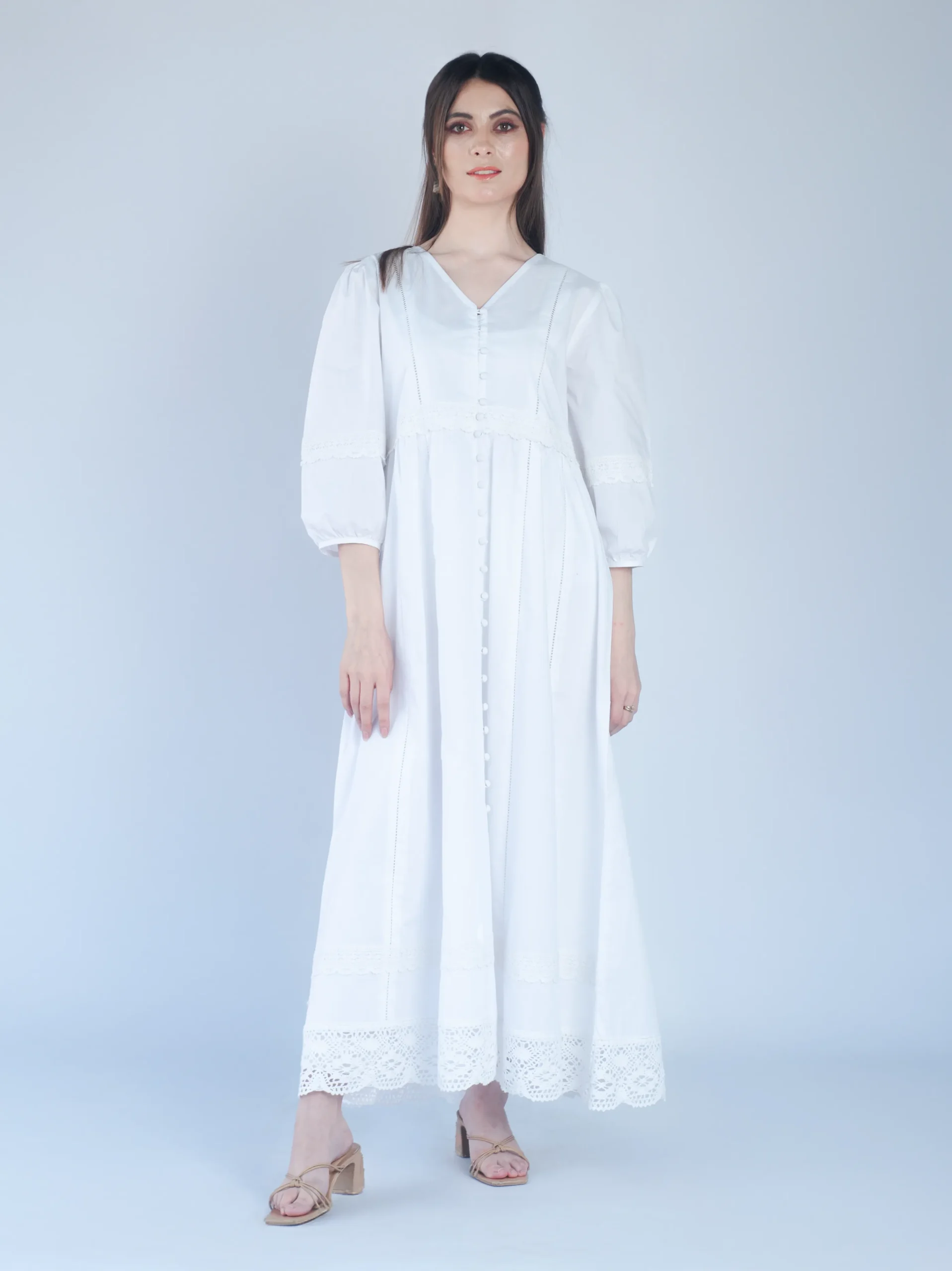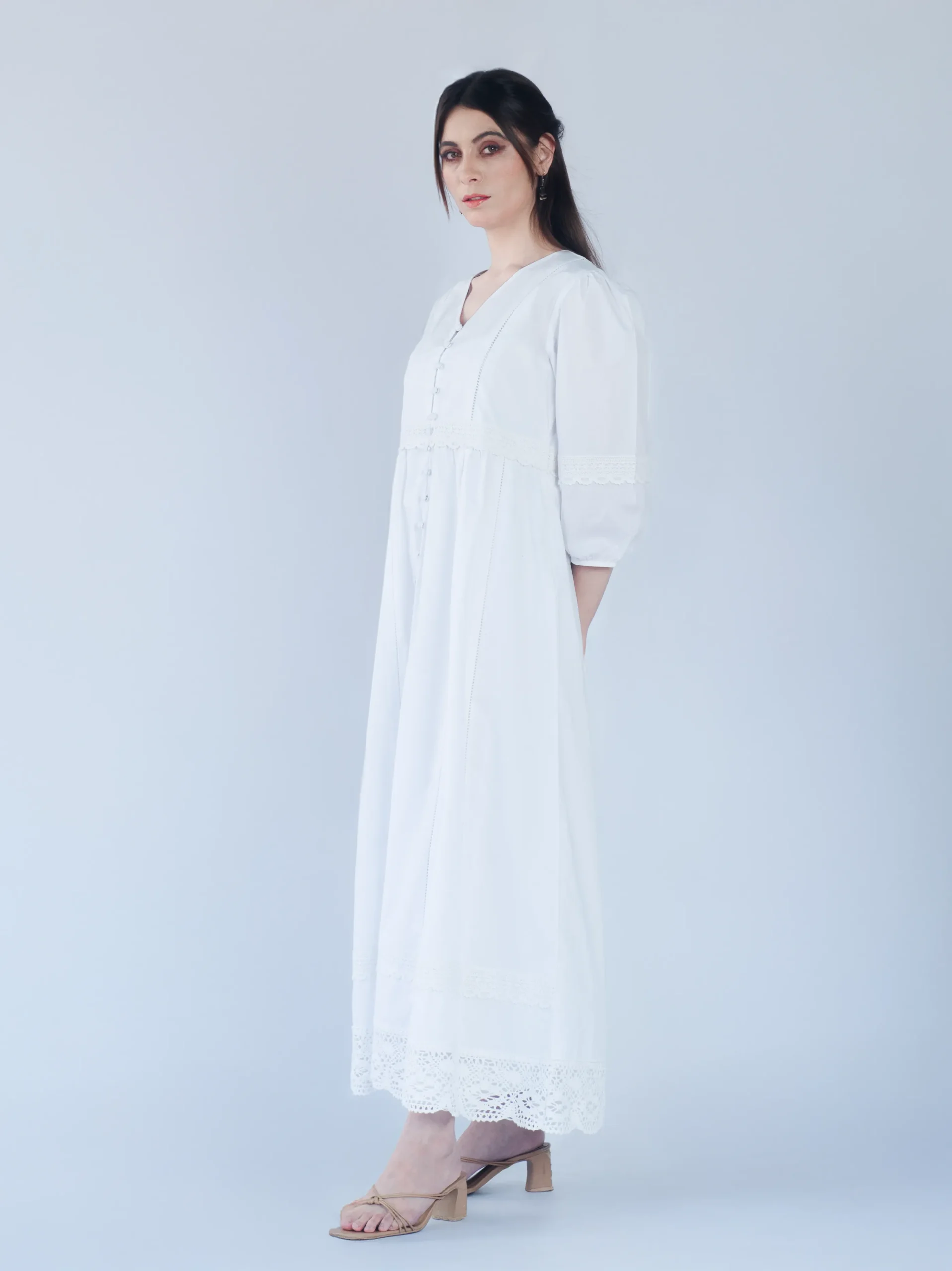 - Long, A-line maxi dress with a V-neck, full-length button placket, and puffed 3/4 sleeves with button closure for an easy, polished look.