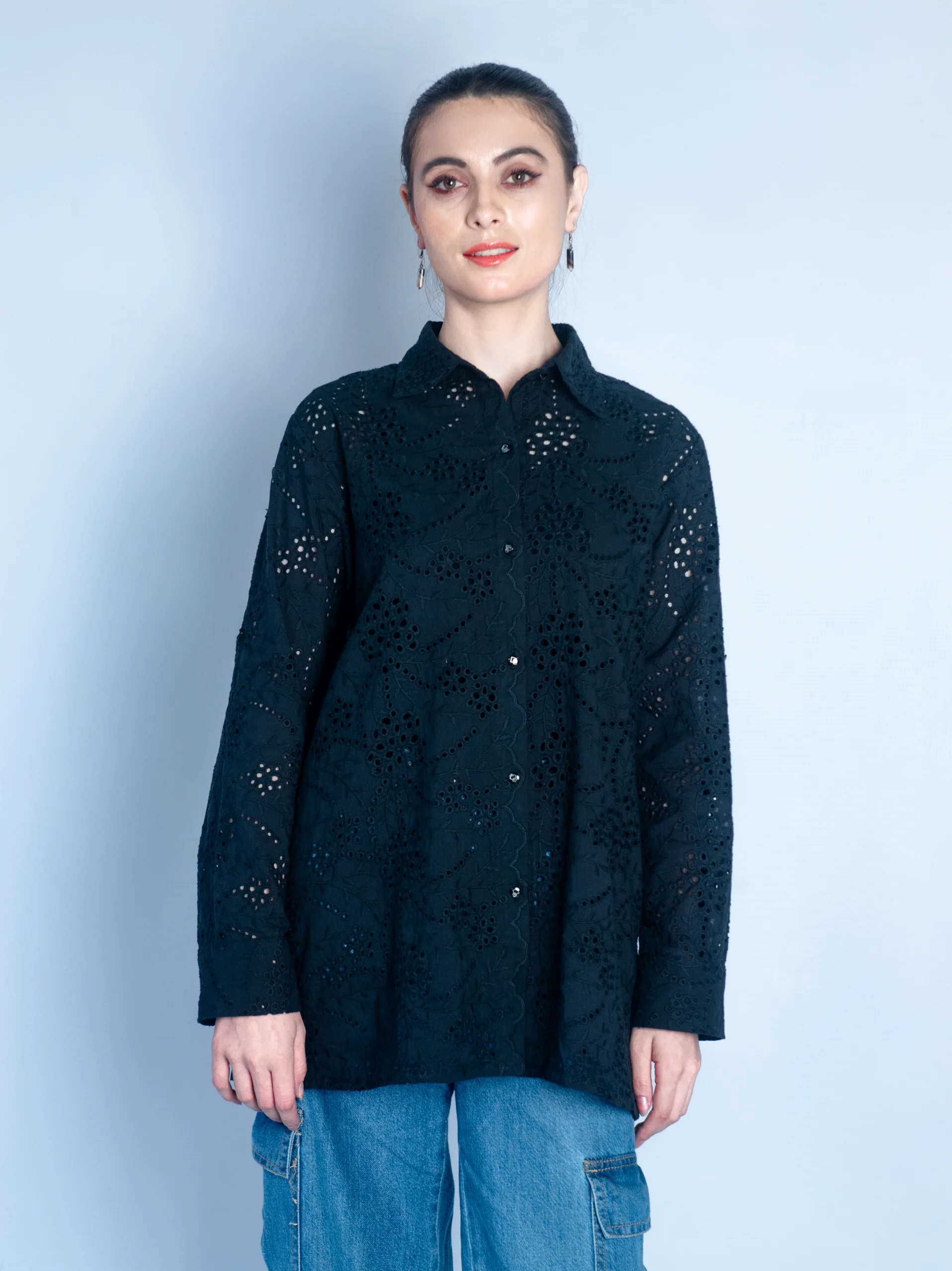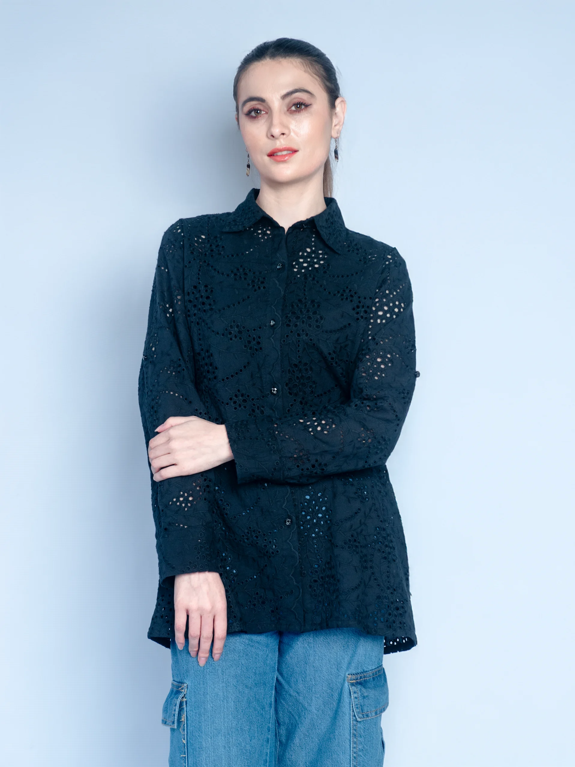 - Long-sleeve button-down shirt with a classic collar, featuring intricate hand-embroidered chikankari patterns throughout the fabric with button closure for an easy, polished look.